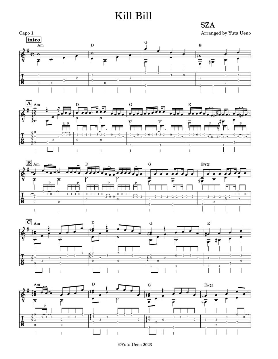 SZA Kill Bill (Fingerstyle) Tab + 1staff by Yuta Ueno